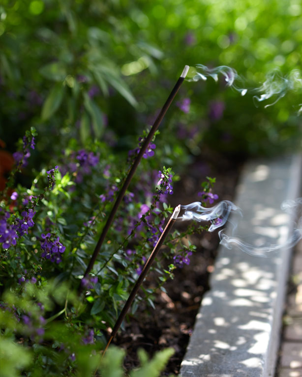 Expert tip: Stick a single incense stick in the ground or planter about 10 feet apart, light the tip, then blow out. Avoid using in a cluster and exposure to rain or moisture. Allow space for ash to fall. Do not place stick in direct contact with plants, fabrics, decor, etc.