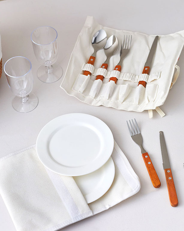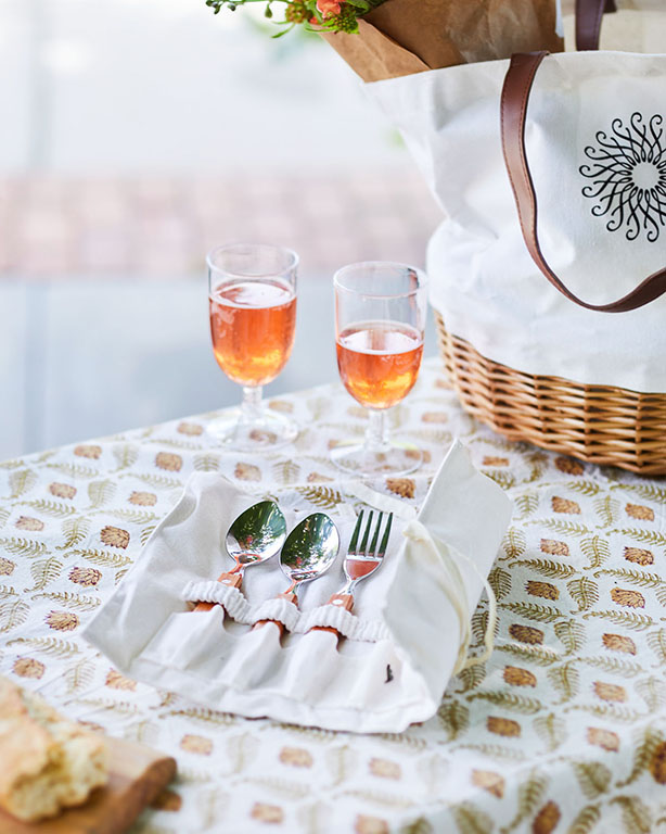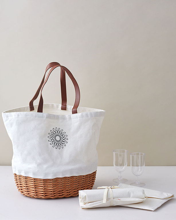 This Longwood exclusive canvas basket tote will be your go to tote to the market, beach or picnics. With a quick cinch closure to keep sand and dirt out, and faux leather straps to swing over your shoulder take this with you next time you’re on the go! Sitting sturdily on a handwoven wicker bottom, this cotton canvas carryall has a spacious interior for your wine, snacks and blanket, while the reinforced straps make it easy to tote wherever your picnic takes you. Inside you’ll find plastic wine glasses, plates and cutlery for two all in their own cotton canvas pouches.