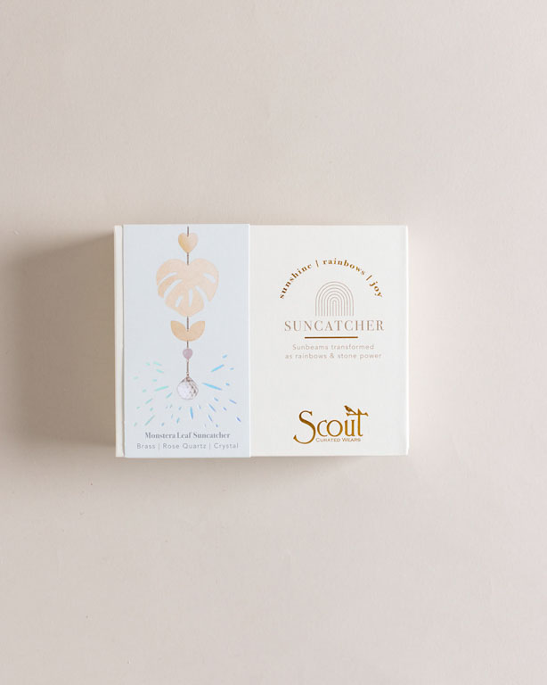Made of brass with gold plating, the suncatcher comes with a suction cup and metal hook to easily attach to windows.